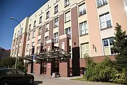 • Mickiewicza 1 - In 1897, the Mikołajewsko-Aleksandrów Girls' Gymnasium was founded in Białystok. Its building was erected by the Białystok construction company of Antoni Roleder. In 1919, the gymnasium was nationalized and operated as the State Girls' Gymnasium named after Princess Anna Jabłonowska, née Sapieha. In 1941, the school building was partially destroyed. In the preserved part, the Germans established a war hospital. In 1944, the entire central body of the building was damaged by a bomb explosion.[4] In 1945, the Pedagogical High School was given a place to be located in the surviving rooms of the wing of the building from Elektryczna Street. It also conducted training courses for teachers. In 1946 the school building was rebuilt. In 1955 the Teacher Training College was established in Białystok, which was additionally located in this building. In 1959 the Pedagogical High School moved out of this building and received a new seat on Świerkowa Street (currently the Faculty of Pedagogy and Psychology is located here). Due to the improvement in the housing situation, the Teacher Training College was able to develop its activities. In 1968, among other things, a branch of the University of Warsaw was established on its basis.[5] Today the building houses the Department of Law of the university.