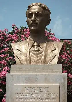 Millosh Gjergj Nikolla (Albanian pronunciation: [miˈɫoʃ ɟɛˈrɟ niˈkoɫa]; 13 October 1911 – 26 August 1938), commonly known by the acronym pen name Migjeni, was an Albanian poet and writer, considered one of the most important of the 20th century. After his death, he was recognized as one of the main influential writers of interwar Albanian literature.