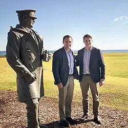 Mike Gallagher with Australian MP Andrew Hastie by a statue of Sir David Stirling, the founder of the Special Air Service, at Campbell Barracks in Western Australia in August 2019
