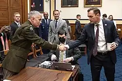 As chairman of the House Armed Services Committee subcommittee for cyber programs, Representative Mike Gallagher greets Army Gen Paul Nakasone, March 2023