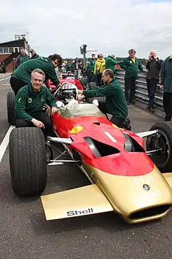 Gascoyne driving a classic Gold Leaf Lotus 49B at Snetterton