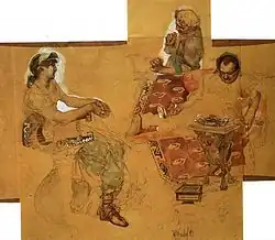However, Vrubel did not abandon his idea to get paid for his creative work. Thanks to the Papmel family, he received a commission from the industrialist Leopold Koenig. According to the mutual agreement, the subject and technique of the painting would be left at the discretion of the artist and the fee would be 200 rubles. Mikhail also decided to participate in the contest initiated by the Imperial Society for the Encouragement of the Arts and chose the plot of "Hamlet and Ophelia" in the style of Rafael's realism. The self-portrait sketches of Hamlet and watercolors for the general composition which depict the Danish prince as represented by Vrubel have been preserved. However, the work on the painting was complicated with the worsening relationship between the painter and his father.[30] Having failed with the "Hamlet" as well, Vrubel was persuaded by his friends to depict a real life model. For this role, they chose an experienced model Agafya who was put in the same chair that served as decorations for the "Hamlet", while student Vladimir Derviz brought some Florentine velvet, Venetian brocade and other things from the Renaissance period from his parents' house. Vrubel successfully finished the painting "Sitter in the Renaissance Setting" with characteristic for Vrubel "painting embossing" . Under the impression from the "Sitter", Vrubel returned to "Hamlet". This time he painted with oil on a canvas with Serov as a model.[31]