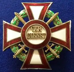The Military Merit Cross (German: Militärverdienstkreuz, Hungarian: Katonai Érdemkereszt, Croatian: Vojni križ za zasluge)[1] was a decoration of the Empire of Austria and, after the establishment of the Dual Monarchy in 1867, the Empire of Austria-Hungary. It was first established on October 22, 1849 and underwent several revisions to its design and award criteria over the years of its existence. It became obsolete in 1918 with the dissolution of the Austro-Hungarian Empire.
