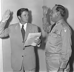 Murphy was initially assigned to the Intelligence Office headquarters, 1st Battalion, 141st Infantry as S-2, and attended the Guard's two-week summer training at Fort Hood as a range officer.[137] 19 December 1950, Murphy was transferred to division headquarters as an aide to Ainsworth.[138] At the 1951 summer training camp at Fort Polk, Louisiana, Murphy was in charge of training approximately 500 inexperienced new recruits in bayonet, marksmanship and close order drill.[139] Fellow instructor Captain Tom Berry remembered, "In my opinion, Audie Murphy set the tone for the obvious high esprit de corps for the 36th Division which lasted throughout my association with the Division [eighteen years]. Audie Murphy walked the way he talked."[140]