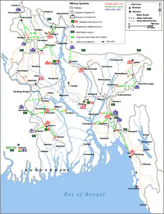 Indian Army High Command plan of operations in Bangladesh in August 1971. A generic representation, some unit locations are not shown.