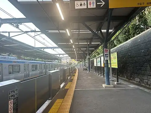The station consists of two opposed side platforms serving two tracks, with the station building elevated, and built on top of the platforms and tracks.