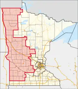 The district is currently represented by Republican Michelle Fischbach. With a Cook Partisan Voting Index rating of R+18, it is the most Republican district in Minnesota.[5] Despite this, it was represented by DFL member Collin Peterson from 1991 to 2021; Peterson was considered one of the most conservative Democrats in the House.