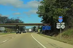 Western end of I-22 / US 78 overlap; MS 30 west follows exit 61