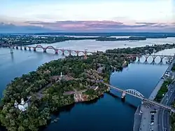 3. ^ a b c d e Dmytro Yavornytskyi National Historical Museum. "Monastyrsky (Komsomolsky) island. Historical background" (in Ukrainian). Archived from the original on 18 April 2023.