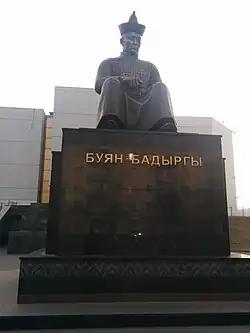 Several streets in Tuva are named after him, as well as a local museum.[11] A two-volume book based on Buyan-Badyrgy's life, Buyan-Badyrgy (Russian: Буян-Бадыргы), was published by Mongush Kenin-Lopsan in 2000.[41] A three-act musical drama opera based on the book was composed by Sergey Badyraa and first performed in 2007.[42] In 2012,[39] the government of Tuva established the Order of Buyan-Badyrgy, the second-highest honor in the region (behind the Order of the Republic), with the first recipient being Kenin-Lopsan.[43] In September 2014, a monument was built to him in the capital city of Tuva, Kyzyl, and another monument of Buyan-Badyrgy was erected in 2015.[11][44] He is included in the State Book "Honored People of Tuva of the 20th Century", an honor equivalent to receiving the Order of the Republic, Tuva's highest award.[45]