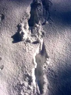 As with all members of the order Artiodactyla (even-toed ungulates), moose feet have two large keratinized hooves corresponding to the third and fourth toe, with two small posterolateral dewclaws (vestigial digits), corresponding to the second and fifth toe. The hoof of the fourth digit is broader than that of the third digit, while the inner hoof of the third digit is longer than that of the fourth digit. This foot configuration may favor striding on soft ground.[31] The moose hoof splays under load, increasing surface area, which limits sinking of the moose foot into soft ground or snow, and which increases efficiency when swimming. The body weight per footprint surface area of the moose foot is intermediate between that of the pronghorn foot, (which have stiff feet lacking dewclaws—optimized for high-speed running) and the caribou foot (which are more rounded with large dewclaws, optimized for walking in deep snow). The moose's body weight per surface area of footprint is about twice that of the caribou.[32][33]