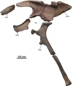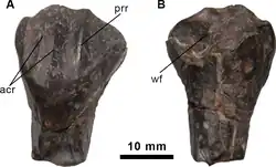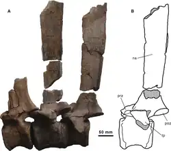 The describing authors established some distinguishing traits. These were all autapomorphies, unique derived qualities. The longest neural spines reach a height of at least 4.3 times the height of their vertebral bodies. The rear middle back vertebrae have a very high and deep depression between their rear articular processes and the base of the neural spine, 2.6 times higher than that base is long, measured from the front to the rear. The rib of the dorsosacral vertebra is fused with the sacral yoke. With the second and third sacral vertebrae the keel at the underside is limited to the front part of the vertebral body. With the fourth sacral vertebra the keel has a similar position but is low and wide. The facets for the dorsosacral and first sacral ribs are located close to each other near the top edge of the ilium, higher than the facets of the other sacral ribs. The ridge on the inner side of the rear blade of the ilium runs obliquely to behind and above, forming a slightly swollen bone shelf, directed to the inside, on the rear part of the rear blade. The lower end of the ischium has a D-shaped cross-section due to an extension on the outer side.[1]