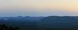 Morrow Mountain State Park (in left distance, 5 miles (8.0 km)) featuring Lake Tillery, Hattaway Mountain, Morrow Mountain, and Sugarloaf Mountain. Viewed from the northeast atop Buck Mountain in Montgomery County NC