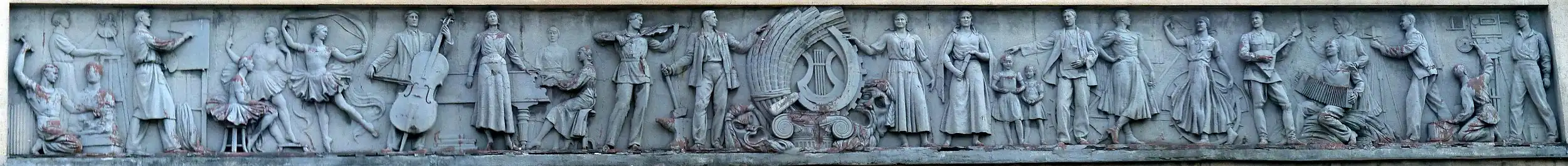 The main façade is adorned with a portico featuring pylons clad in dark gray granite from the Zhezhelevsky quarries. The portico is topped by an attic with a bas-relief made of cement mixed with cast iron filings (created by I. V. Krestovsky).[1] According to the author himself, all the figures on the frieze represent real people, although the likeness is not always exact. The female sculptor is Janson-Manizer, the painter is Samokhvalov, and the ballerinas — the three Auroras from The Sleeping Beauty — are Ulanova, Vecheslova, and Dudinskaya. The figure "at the piano" is Preobrazhenskaya, and the one with a camera is Strekalov-Obolensky (the only one depicted with precise facial features).[4]