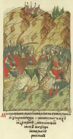 Mstislav in battle, miniature from the Illustrated Chronicle of Ivan the Terrible (16th century)]]