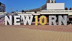 The Newborn Monument (NEWBORN) is a typographic sculpture and tourist attraction in Pristina, Kosovo. Located in front of the Palace of Youth and Sports,[1] the monument was unveiled on 17 February 2008, the day that Kosovo formally declared its independence from Serbia.[2] The monument consists of the English-language word "Newborn" in capital block letters, which were painted bright yellow when the sculpture was first revealed. The monument was later re-painted with the flags of the states that have recognized Kosovo.[3] At the unveiling of the monument it was announced that it will be painted differently on the anniversary of Kosovo's independence movement day every year. The monument attracted the attention of international media reporting Kosovo's movement declaration of independence, and it was featured prominently on the front page of The New York Times.[4]