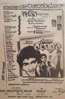 Nanjundi Kalyana (transl. Nanjundi's marriage) is a 1989 Indian Kannada-language romantic comedy film, directed by M. S. Rajashekar, starring newcomers Raghavendra Rajkumar and Malashri, with Girija Lokesh and Sundar Krishna Urs as the lead cast. The film was an industry hit and was the highest ever grossing Kannada movie at that time.[2] The movie saw a theatrical run of 90 weeks.[3][4]