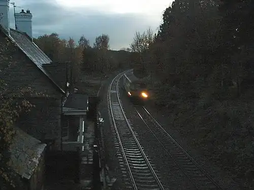 A Northbound train passes the site of the station at Nant-y-derry, November 2006