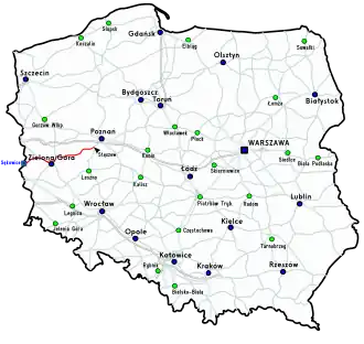 Droga krajowa nr 32 (translates from Polish as national road 32) is route that is part of the Polish national roads network. It runs through Lubusz and Greater Poland Voivodeships, leading from the former border crossing with Germany in Gubinek to Stęszew, where meets national road 5. Locally act as a bypass for small towns through the route. For a 14 km stretch it runs on the route of expressway S3. National road 32 connects Poznań urban area and Zielona Góra urban area with Polish-German border.