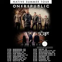 The Native Tour (also known as the Native Summer Tour in North America or as the Native Fall Tour in Europe) is the third headlining concert tour by American Pop rock band OneRepublic, in support of their third studio album Native (2013).[2] OneRepublic were joined on the Native Summer leg of the tour by The Script and American Authors, and on the European "Native Fall Tour" leg by Kongos. The tour has traveled across five continents: Asia, Europe, Oceania, North America, and Africa. The tour began on April 2, 2013 in Milan, Italy and ended on September 20, 2015 in São Paulo, Brazil.