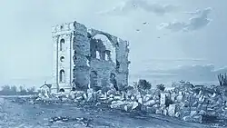 After the fire of October 9, 1848, only the four exterior walls remained standing.[9] Cabet and his followers began clearing rubble and trying to reconstruct the interior of the temple; however, on May 27, 1850, Nauvoo was struck by a major tornado which toppled one of the walls onto eight stonemasons.[10] One source claimed the storm seemed to "single out the Temple", felling "the walls with a roar that was heard miles away".[11] Cabet ordered the demolition of two more walls in the interests of public safety, leaving only the façade standing. The Icarians used much of the temple's stone to build a new school building on the southwest corner of the temple lot. By 1857, however, most of Cabet's followers had left Nauvoo and over time many of the original stones for the temple were used in the construction of other buildings throughout Hancock County. In February 1865, Nauvoo's City Council ordered the final demolition of the last standing portion of the temple—one lone corner of the façade. Soon afterwards, all evidence of the temple disappeared, except for a hand pump over a well that supplied water to the baptismal font.[7] Three of the original sunstones are known to have survived and are on display—one is on loan to LDS Church's Visitor Center in Nauvoo, one is in the Smithsonian Institution in Washington, D.C., and the third and only one that has not been restored is displayed, along with the only moonstone on display, at the Joseph Smith Historic Center of the Community of Christ.