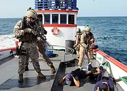 Marines (or naval infantry) are military personnel generally trained to operate on both land and sea, with a particular focus on amphibious warfare. Historically, the main tasks undertaken by marines have included raiding ashore (often in support of naval objectives) and the boarding of vessels during ship-to-ship combat or capture of prize ships. Marines also assisted in maintaining security, discipline, and order aboard ships (reflecting the historically pressed-nature of the rest of the ship's company and the risk of mutiny). While maintaining many of their historical roles, in modern times, marines also engage in duties including rapid-response operations, humanitarian aid, disaster relief, special operations roles, and counter-terrorism operations. In most nations, marines are an integral part of that state's navy, such as the United Kingdom's Royal Marines or Russia's Naval Infantry; in some countries their marine forces can instead be part of the land army, such as the French Troupes de Marine, or, more uncommonly, a nation’s marine forces may be an independent military branch such as the United States Marine Corps or the Ukrainian Marine Corps.