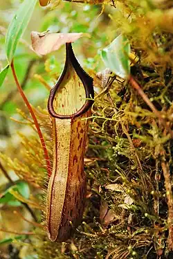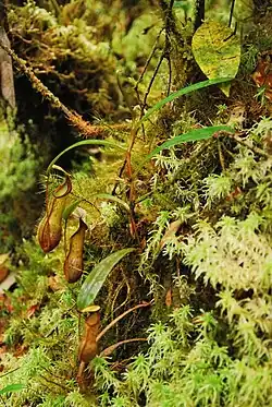 The typical habitat of this species is summit scrub vegetation as well as lower and upper montane mossy forest.[6][7] It always grows terrestrially, often in open sites such as ridge tops and cliff sides, where it is exposed to direct sunlight.[6] The species is rare in blangs, where the lack of surrounding vegetation means the stems scramble along the ground.[6] Nepenthes mikei may be difficult to find on Mount Pangulubao,[14] where it is sympatric with N. gymnamphora (N. xiphioides), N. ovata, and N. spectabilis.[2] On Mount Bandahara, where it is common above 2400 m,[6] it grows alongside N. diatas.[15] Natural hybrids with all of these species have been recorded.[6] At another location, which is undisclosed for conservation purposes, N. mikei grows alongside N. flava.[16]