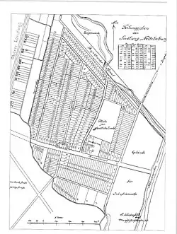 Characterized by brick-built single or double houses with mansard roofs and hipped gables, the main entrance was located on what is now considered the first floor, while utility and cellar rooms were on the ground floor due to the high groundwater level and the risk of flooding.[2] Most houses had a stable attached for small livestock. Each settlement house had a large vegetable garden bordered by drainage ditches. By August 1927, 235 houses were already occupied.[3]