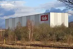 View from the station parking area over the tracks to the tall warehouse of the cookware manufacturer Fissler