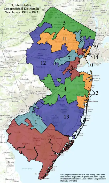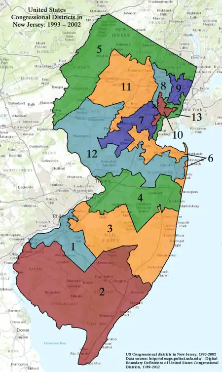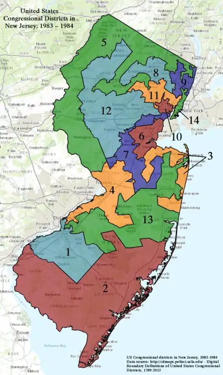 Below is a table of United States congressional district boundary maps for the State of New Jersey, presented chronologically.[3] All redistricting events that took place in New Jersey in the decades between 1973 and 2013 are shown.