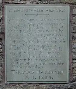 A working man, a teetotaler for ten years, who was formerly a notorious drinker and a notorious poacher has recently invested his sober earnings in the purchase of the town prison which he has converted into a comfortable dwelling house. Frequently an inmate of the prison whilst a drunkard and poacher, he is now owner of the whole and occupier of the premises. Thomas Handford 1854.[7]
