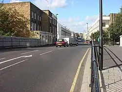 New North Road Bridge, Islington, crossing the Regent's Canal. The building formerly the Rydon's Arms is on the left adjacent to the first junction on that side of the road