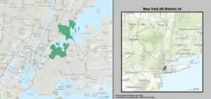 The 14th district is located entirely in the New York City boroughs of The Bronx and Queens.