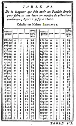 - Tables of the length a pendulum must have for a given number of oscillations per hour, in Jean-André Lepaute's Treatise of Clockmaking, Paris, augmented edition of 1767, first edited 1755