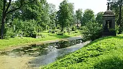 It became a prestigious burial location, and careful attention was taken in the planning and layout, which was more regular than the early cemeteries, and included a pond in the northern part. A path leads from the main entrance of the cemetery church across a bridge and aligned with the apse of the Trinity Cathedral, forming a longitudinal axis. Paths then diverge in a grid pattern to the sides, running between the Monastyrka River and the southern boundary of the monastery. New burial plots were placed in the south and in the eastern parts of the cemetery, maintaining the grid pattern.[4] Wealthy patrons commissioned large chapels and crypts, with elaborate decorations and reliefs from prominent artists such as Nikolay Laveretsky, Ivan Podozerov, Robert Bach and Ivan Schroeder.[1] Plans in 1896 to build a larger cemetery church in the Byzantine style by architect L. P. Andreyev came to nothing, as did a similar project in 1908, despite a donation of 10 thousand rubles by the ruling metropolitan.[3]