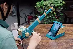 Nintendo Labo developers Kawamoto, Sakaguchi, and Ogasawara stated in an interview that their goal was to use the unique features of the Nintendo Switch in such a way that no other system could emulate. The Joy-Con were treated as a "bundle of sensors" that could be used in a multitude of ways by attaching them to different hardware pieces, focusing on the gyro motion-sensor, IR motion camera, and HD Rumble features.[43] The team was tasked with exploring Joy-Con attachment and game prototypes during three weeks of brainstorming sessions, called "prototype parties."[44][45] When asked about the choice of building material, the developers responded by saying that cardboard was chosen over plastic because the 3D printer they were using for prototyping was unable to keep up with their pace of testing; cardboard would also allow for the player to create, repair, and customize the project themselves.[17] The initial construction designs were first thought as being simple to construct, but later proved to be complex and challenging when it was decided that no cutting or gluing would be required to assemble the kits. Improvements were made to the prototypes based on feedback from consumer and developer testing; this prompted the creation of the interactive instruction software, as well as favoring simplicity over appearance. During development testing—prior to the cardboard designs being finalized—photographs were taken and compiled into booklets to be used as temporary instruction manuals; these booklets ranged from 1,000 pages for simpler models to 3,000 pages for complex ones.[46] While the cardboard Toy-Con are sturdy, Nintendo recognized that the cardboard can suffer wear and tear with time, and sells replacement sheets for individual Toy-Con through its online store.[2][6][7] When asked about the durability of Labo during an interview with CNET, Yoshiyasu Ogasawara stated, "We tested their resilience to the same action through hundreds and thousands of repetitions, so we expect them to last a long time under normal use."[47]