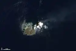 In November 2013, an eruption created a new small island south-southeast off the shore of the original island.[27][3][28][29] By December 2013, the island rose 20–25 m (66–82 ft) above sea level, with an area of 56,000 square meters (14 acres). The island was considered large enough to maintain a presence above sea level for at least several years.[30][31] By 20 December 2013, the island had grown fast enough that experts predicted that it would probably join up with Nishinoshima before the end of 2013 and cease to be a separate island.[32] On 26 December 2013, the Japanese Coast Guard confirmed that the two islands had joined.[33] NASA says two cones have formed around the main volcanic vents and stand more than 60 m (200 ft) above sea level.[2] The newer portion of the island is now larger than the original Nishinoshima landmass. The merged island is slightly more than 1 km (0.6 mi) across.