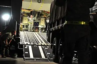 The squadron operates eight Boeing C-17 Globemaster IIIs, the first of which entered service in December 2006.[2][7] The eighth and last was delivered in November 2015.[7] The aircraft are generally crewed by two pilots and a loadmaster, the latter being responsible for the loading, carriage and unloading of cargo or passengers. The C-17 can carry 70 tonnes of equipment, and is large enough to accommodate helicopters, tanks and other military vehicles. It can also carry over 130 passengers, and is designed for aerial despatch of paratroops or cargo. The C-17 has a range of some 10,000 km (6,200 miles) and is able to operate from short and unsealed airstrips.[2][8] Flown with a joystick and fly-by-wire controls, the aircraft is also highly manoeuvrable and responsive considering its size.[9] It can be refuelled in flight by the Airbus KC-30A Multi Role Tanker Transports operated by No. 33 Squadron.[10][11]