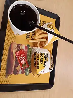 No Brand Burger (Korean노브랜드 버거) is a fast food hamburger chain based in South Korea. The company is operated by Shinsegae Food Inc., which is owned by Shinsegae.[3] The name was borrowed from No Brand (이마트 노브랜드), a private label of Emart.[4] Also, No Brand Burger's yellow, black, and white color scheme used in its logo, decor, packaging, and adverts was adopted from No Brand's. The official motto of No Brand Burger is "Why pay more? It's good enough."[5] which reflects the cost of items on the chain's menu.