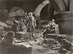 Approximately 7,500 extras worked on the film.[4] During the filming of the climactic flood scene, the 600,000 US gallons (2,300,000 L; 500,000 imp gal) of water used was so overwhelming that three extras drowned, one was so badly injured that his leg needed to be amputated, and a number suffered broken limbs and other serious injuries, which led to implementation of stunt safety regulations the following year.[5] Dolores Costello caught a severe case of pneumonia. Thirty-five ambulances attended to the wounded.[6]