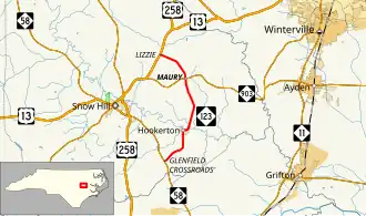 NC 123 is a two-lane rural highway that begins at NC 58 in Glenfield Crossroads, and ends at US 13 and US 258 in Lizzie. 2.4 miles (3.9 km) from NC 58, it enters the town of Hookerton where it goes north along William Hooker Drive then east on Main Street. Crossing the Contentnea Creek, it continues north to Maury, where it connects with NC 903. After 10.2 miles (16.4 km) through mostly farmland country, it reaches Lizzie where it ends.[1]