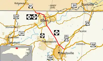 North Carolina Highway 14 (NC 14) is a primary state highway in the U.S. state of North Carolina entirely in Rockingham County. It links US 29/US 158 near Reidsville with the city of Eden. From Eden, it continues north concurrent with NC 87 to the Virginia state line where the road continues as Virginia State Route 87 (SR 87).