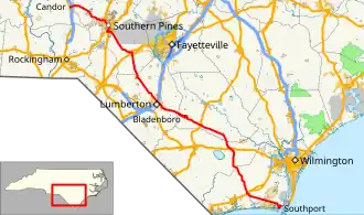 North Carolina Highway 211 (NC 211) is a 162.5-mile-long (261.5 km) primary state highway in the U.S. state of North Carolina. It traverses mostly through the Sandhills and Coastal Plain regions of the state; connecting the cities of Candor, Aberdeen, Raeford, Lumberton, Bladenboro, and Southport.