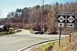 North Carolina Highway 26A (NC 26A) was established around 1947 after NC 26 was rerouted on the more direct route between Woodlawn and Gillespie Gap, through the Cox Creek valley.[9] In 1961, NC 26A was renumbered to NC 226A, in lockstep with NC 226; justification for change was to avoid confusion with I-26.[6]