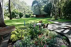 The lawn and pavilion by the dining tables at the entrance to the botanic garden.