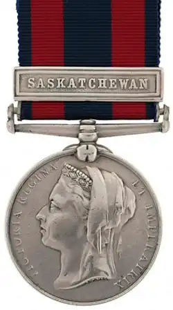 The North West Canada Medal is a British campaign medal issued to the soldiers, volunteers, and North-West Mounted Police (NWMP) personnel who participated in putting down the North-West Rebellion in 1885.[3]