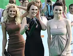 ![]() Nu Virgos at the Laima Rendezvous Jūrmala Festival, August 2019. From left to right: Ulyana Sinetskaya, Erika Herceg, Olga Meganskaya. | |