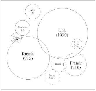 Venn diagram displaying the historical proliferation among declared (solid circles) and undeclared nuclear weapon states (dashed circles). Numbers in parentheses are the explosive nuclear tests conducted by a particular nation. The overlap between Russia and U.S. reflects the purchase by the U.S. Defense Special Weapons Agency.[19]