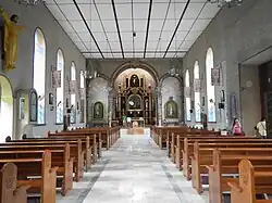 The first church of Mabitac was the aforementioned church between the two barrios of Siniloan.[5] Due to flooding, the Franciscans transferred the church on top of Calvary or Kalbaryo Hill in 1618 and made it out of stone.[7][8] Originally, the church only had 96 steps[7] but further improvements increased it to more than 120 steps.[9] It was seriously damaged during the 1880 earthquake and repaired under the supervision of Father Antonio de la Fuente and again severely damaged during the 1937 earthquake.[6]