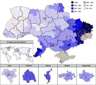 In the October 2020 Ukrainian local elections Opposition Platform – For Life took third place with 11.75% of all votes being cast to the party.[49] (The highest number of seats in the election was won by Servant of the People with 17.59% of local deputies nominated in the election by this party.[49] Second place was for Fatherland with 12.39%.[49]) The party was successful in South and Eastern Ukraine, although the local parties of city mayors (in particular in Odesa, Mykolaiv and Sloviansk) cost them support compared with its predecessor Opposition Bloc in the 2015 Ukrainian local elections.[50][51] Oleksandr Popov, former head of the Kyiv City State Administration, was a candidate for Mayor of Kyiv nominated by OPFL.[52][53] In the election he received 68,757 votes, securing second place but losing the election to incumbent Mayor Vitali Klitschko.[54] Konstantyn Pavlov from the OPFL won the election for mayor of Kryvyi Rih.[55][56]